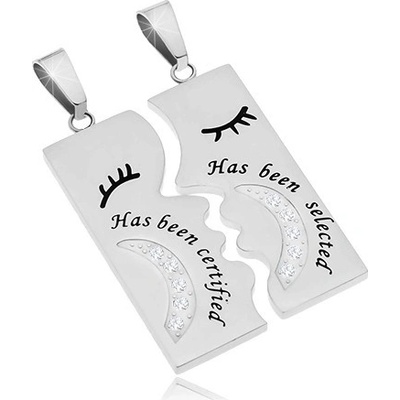 Ocelové přívěsky pro zamilované, lesklé obdélníky představující líbající se zamilovanou dvojici, čiré zirkony, nápisy.