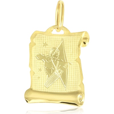 V jemném půvabu žlutého zlata vyniká krása kombinace hladké lesklé a zmatněné povrchové úpravy. Přívěsek znamení Střelec ryzosti 14 karátů tvaru pergamenu krášlí obě tyto...