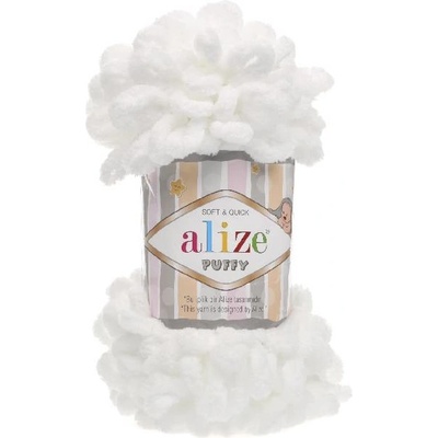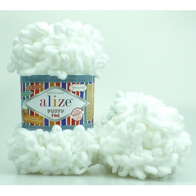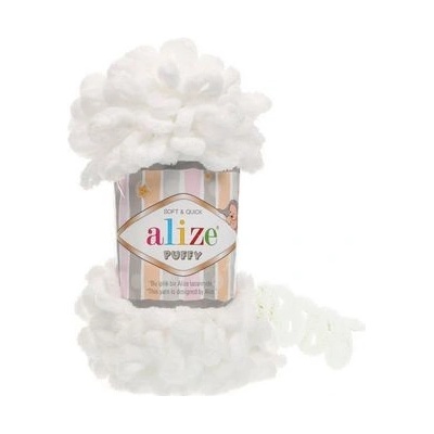 Alize Puffy - 100% mikropolyester, klubíčko 100 g - 9,2 m Úžasně jemná chlupatá příze s předpřipravenými velkými oky, na kterou nebudete potřebovat jehlice ani háček. Je vhodná zejména na výrobu dětských dek a přikrývek, které vytvoříte snadno a rychle jen svými prsty.