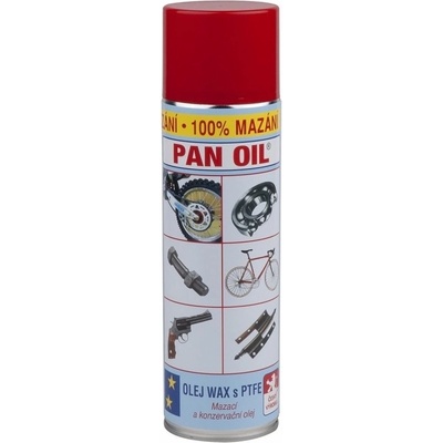 OIej Panoil, olej WAX s PTFE aerosol 500ml Olej Panoil - popis: kvalitní mazací a konzervační olej na řetězy bicyklů, ostatní mechanismy a kovy. Obsahuje vosk a PTFE (suché mazivo). Na povrchu vytváří suchou a nelepivou protikorozní vrstvu vosku s vysokým obsahem PTFE....