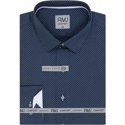 Společenská košile s dlouhým rukávem AMJ v užším vypasovaném střihu Slim Fit v temně modré barvě se světle modrým vzorečkem. Zapínání na temně modré knoflíky. Ušita z příjemného...