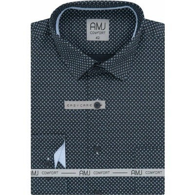 Košile s dlouhým rukávem od značky AMJ v tmavě modré barvě s jemnmým světlým vzorem. Zapínání na tmavě modré knoflíky s bílým pruhem. Má klasický rovný střih. Ušita z...