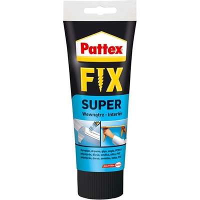 Pattex FIX Super je montážní lepidlo k lepení porézních materiálů pro použití v interiéru. Lepí lehké a savé materiály, např. dekorativní desky, polystyrenové prvky, dřevěné desky a zárubně apod.