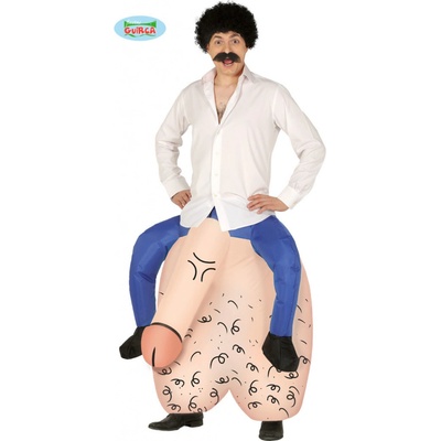 Nafukovací kostým muže sedícího na pánském přirození. Kostým obsahuje pouze spodní díl, košile není součástí. Kostým je vybaven ventilátorem na baterie a je průběžně dofukován.