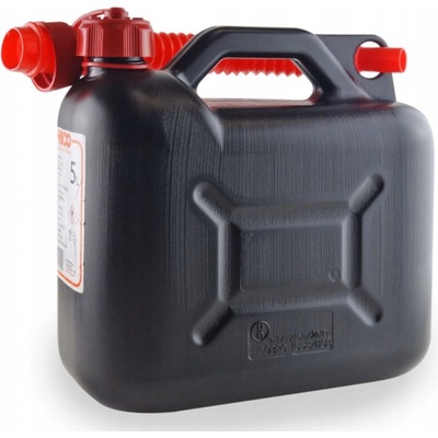Plastový kanystr o obsahu 5 l s odnímatelnou flexibilní nálevkou. Černá barva.
