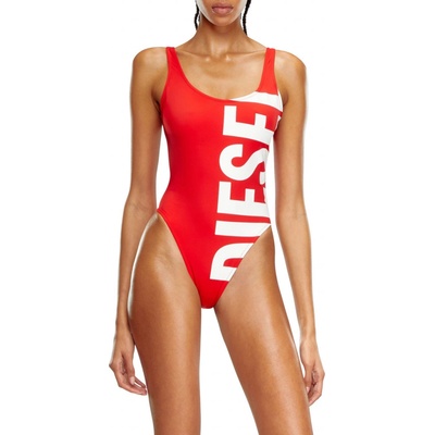 Dámské jednodílné plavky. Vyrobeny z recyklované strečové tkaniny. Na levé straně potištěné maxi logem Diesel, které je na okrajích odříznuto, aby vytvořilo aerodynamickou...