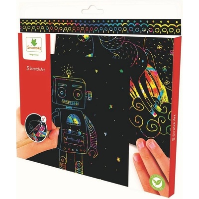 Pět obrázků k vyškrabávání. Obsahuje: 5 škrabacích obrázků o velikosti 17 x 20 cm s různými motivy a dřevěný stylus na vyškrabávání. Rozměry balení: 23 x 21,5 x 1,5 cm. Vhodné pro děti od 5 let.