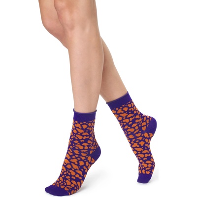 Fialové ponožky se zvířecím vzorem v oranžové barvě. Širší pohodlný lem, anatomická špička a pata. S označením kvality a nezávadnosti Oeko-Tex® Standard 100. Velikost: UNI...