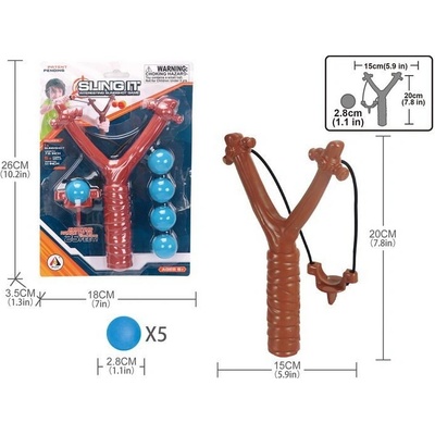 Prak. Velikost 20 cm. Balení obsahuje prak a 5 míčků. Rozměry praku 15x20 cm. Průměr míčku 2,8 cm.