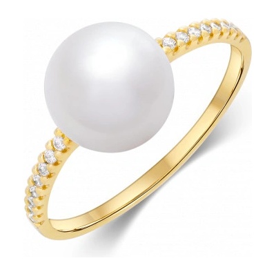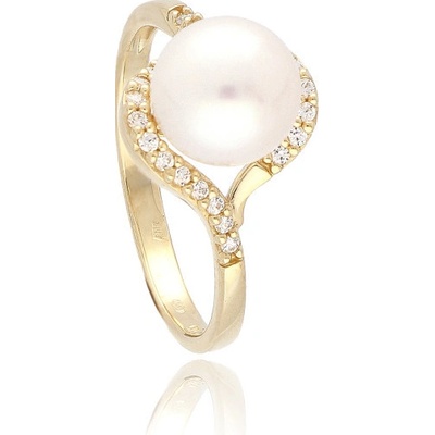 Dámský zlatý prsten s bílou sladkovodní perlou a zirkony. Rozměr perly: 9 mm.