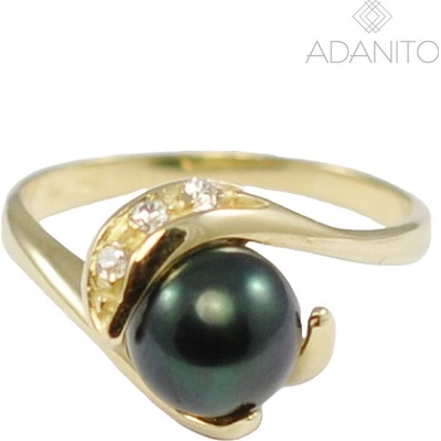 Zlatý perlový prsten je vyrobený ze žlutého zlata a je zdobený tmavou říční perlou a čirými zirkony. Rozměr ozdoby je 10 mm.