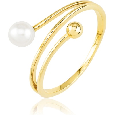 Zlacený celový prsten umělou perlou bílé barvy. Prsten má lesklý povrch v barvě žlutého zlata Prstýnek je vyroben z chirurgické oceli s jakostním označením 316L