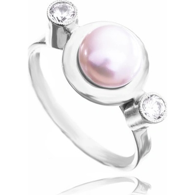 Stříbrný prsten je vyrobený z rhodiovaného stříbra a je zdobený čirými zirkony a říční perlou o průměru cca 7-8 mm.