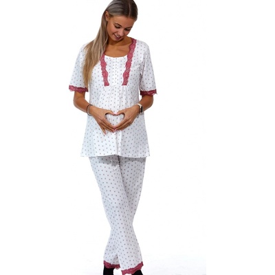Bílé a jemně vínově květované kojící i těhotenské pyžamo lemované vínovou krajkou Bavlněné dámské pyžamo v pojetí maximálního komfortu pro každou kojící ženu. Kabátek má...