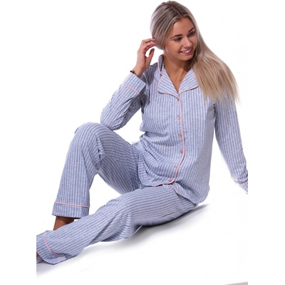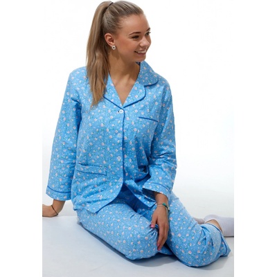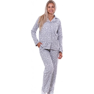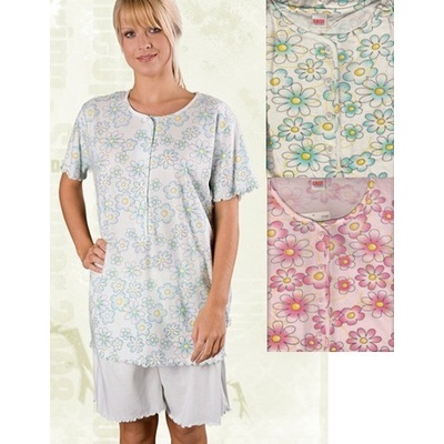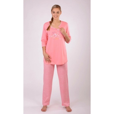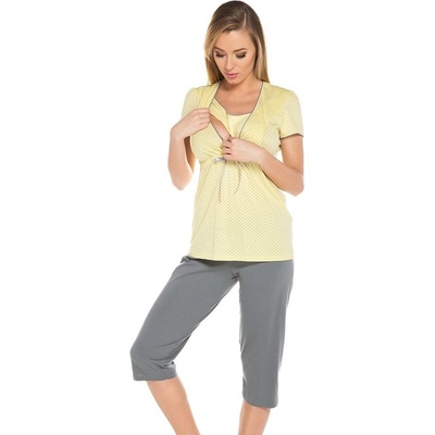 Bavlněné dámské pyžamo na kojení s překladovým výstřihem a vyšším pasem. Přístup pro kojení je decentně skrytý pod látkou trika. Béžový základ se vzorem hnědých pětilístů –...