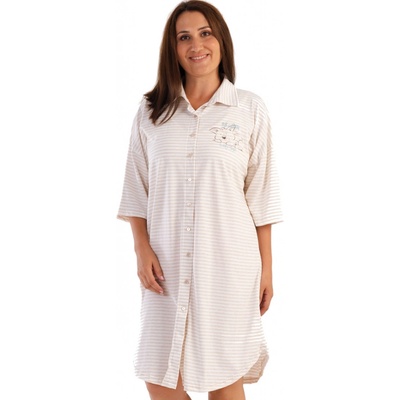 Béžová i světle hnědá pruhovaná košilka celopropínací pro plnoštíhlé kojící ženy s Pejskem Košilka pro těhotné i kojící do porodnice na knoflíky Noční košilka s delším...