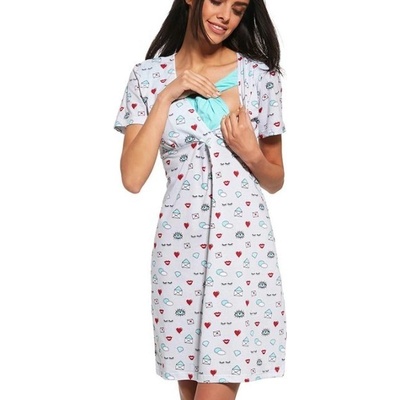 Maminkovská noční košile, s krátkým rukávem, vhodná ke kojení. Praktický podšitý vrch, na odhrnutí po obou stranách, zabezpečí komfort nošení. Vzor listy, pusinky, srdíčka,...
