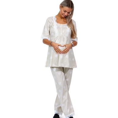 Béžové puntíkaté i srdíčkové kojící i těhotenské pyžamo lemované bílou krajkou Bavlněné dámské pyžamo v pojetí maximálního komfortu pro každou kojící ženu. Kabátek má krátký...