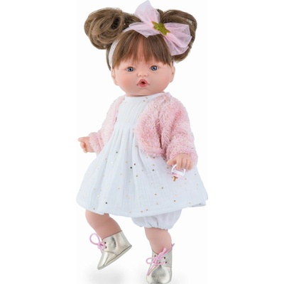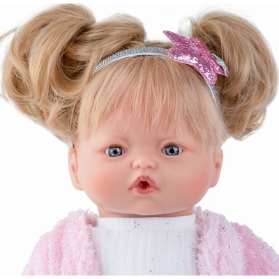 Sympatická panenka Blaženka je vyrobena ve Španělsku firmou Marina & Pau. Má látkové tělíčko, jen nohy, ruce a hlava je z vinylu. Je 40 cm vysoká. Panenka má delší světlé vlasy,svázané do dvou culíků a ozdobené třpytivou čelenkou s hvězdou. Má modré nemrkací oči a...