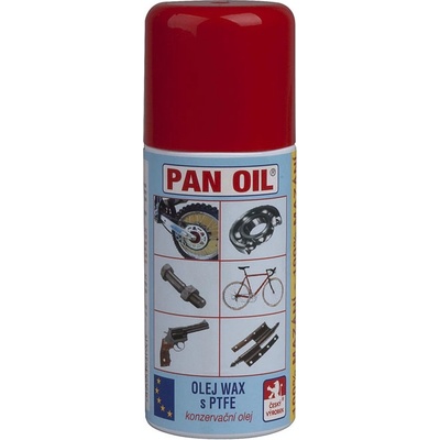 OIej Panoil, spray WAX s PTFE aerosol 150ml Olej Panoil - popis: kvalitní mazací a konzervační olej na řetězy bicyklů, ostatní mechanismy a kovy. Obsahuje vosk a PTFE (suché mazivo). Na povrchu vytváří suchou a nelepivou protikorozní vrstvu vosku s vysokým obsahem...