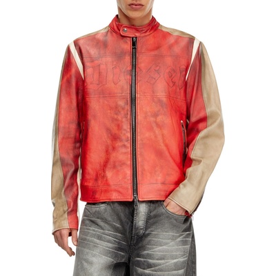 Pánská kožená bunda. Regular rovný střih do pasu v oblíbené biker siluetě. Nápadný červený design je tvořen kontrastními koženými panely. Speciálně ošetřena tonálním...