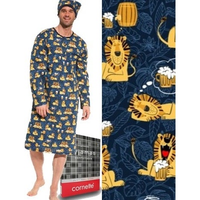 Leo - pánská noční košile, s dlouhým rukávem, má okrouhlý výstřih, s rozepínáním na 3 knoflíčky. Košile je celoplošně vzorována - lev s pivem. Baleno v krabici...