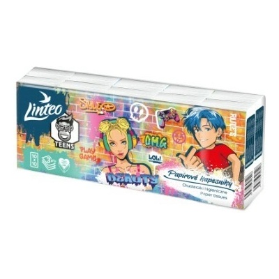 Jemné, třívrství papírové kapesníky Linteo Teens. 10x10 ks v balení. Vyrobeny ze 100% celulózy. Design s cool a edukativním motivem. Výrobek je součástí produktové...