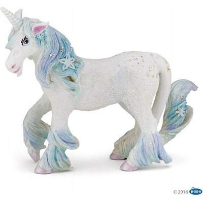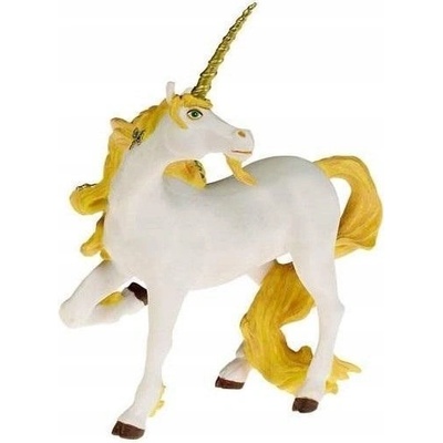 Zlatá hříva , ozdobená květinami, splývá napravý bok jednorožce zn. Papo a na hřbetě mu sedí modrý motýlek. Model zvířátka měří na déliu 12 cm. Hračka pro děti od 3...