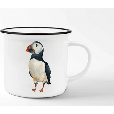 Smaltovaný hrneček neboli plecháček, který je zdobený černým lemem. Plecháček je potištěn autorskou ilustrací papuchalka severního, který byl v originále malovaný...