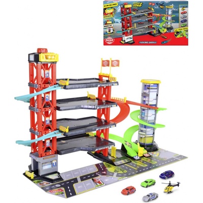 Dětský parkovací dům se závodní dráhou, výtahem a zjezdovou rampou. Obsahuje 4 autíčka, čerpací stanici, dopravní značky a další doplňky.