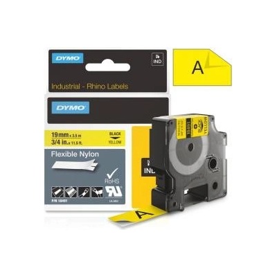 Páska Dymo Rhino (18491), 19mm žlutá, černý tisk, 3,5m - permanentní flexibilní nylonová. Ohebné nylonové štítky jsou vhodné pro zakřivené a rovné povrchy; vodiče a kabely,...