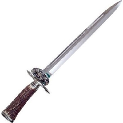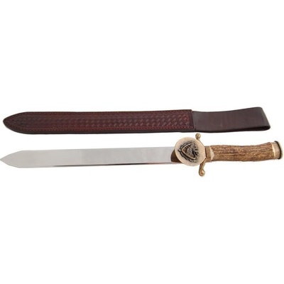 Nerezová čepel, parohová rukojeť, na záštitě motivy zvěře na parohovém podkladě.Délka tesáku 50 cm, šířka čepele 3 cm