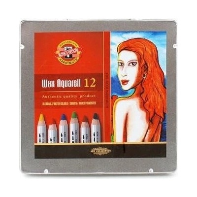 Akvarelové umělecké pastelky Wax Koh-i-noor 12 barev v dárkové plechové krabičce. Průměr pastelky: 11,5 mm Délka pastelky: 123 mm průměr tuhy : 7,1 mm Hladký vysoce...