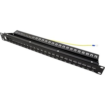 Rám patchpanelu pro osazení modulů keystone, 24 pozic (výška 1U).; Použití: Stíněný patchpanel (možno osadit i nestíněné moduly, ale bez funkčnosti uzemnění) určený pro montáž...