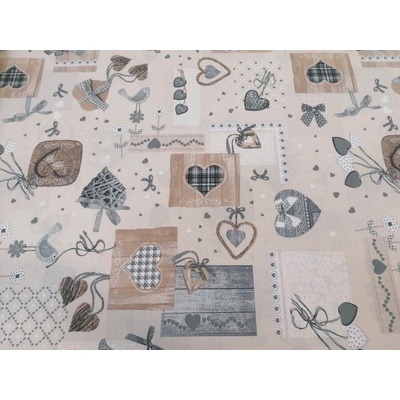 Hustě tkaná bavlněná látka s digitálním potiskem ze 100% bavlny. Bavlněná látka je v metráži o šíři 140 cm. Potisk má patchwork motiv srdíček s rámečky. Z bavlněné látky s...