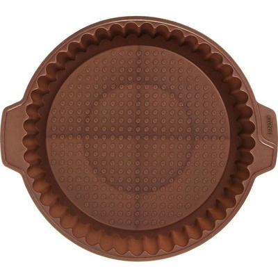 Hnědá silikonová forma o průměru 27 cm, s antiadhézním povrchem, pro přípravu dozlatova vypečeného nadýchaného korpusu, který má zvýšený okraj a po otočení lze vnitřek plnit...