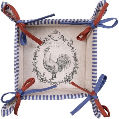 Krásný béžový bavlněný košík na pečivo ve venkovském stylu s modrými a červenými pruhy a ilustrací kohouta. Kuchyňský textilní košík je vyroben ze 100% bavlny a je opatřen 4mi...