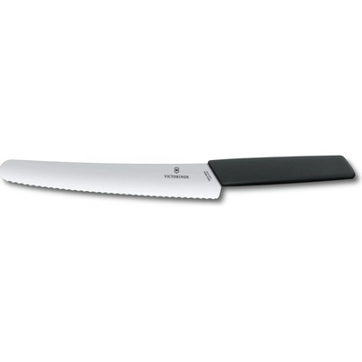 Nůž na chléb a koláče, zoubkované ostří, 22 cm, černý Victorinox 6.9073.22WB Elegantní nůž s rukojetí ze syntetického materiálu. Nůž na chléb a koláče Swiss Modern se skvěle...