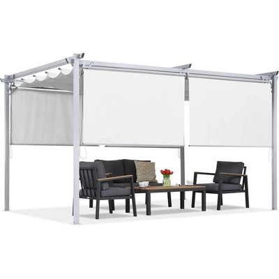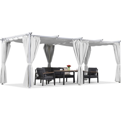 Bílá terasová pergola La Palma 3 × 6 m je moderní zahradní konstrukce. Nastavitelná střecha umožňuje regulovat množství stínu a závěsy poskytují větší soukromí a ochranu před...