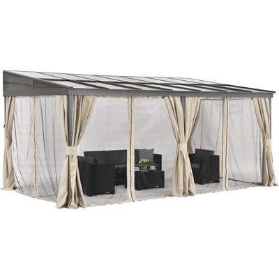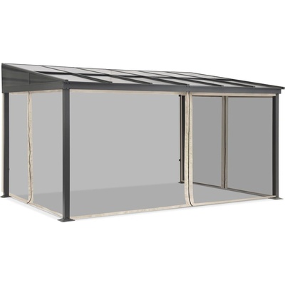Hliníková terasová stříška Tarragona 3 x 6 m s béžovou moskytiérou je stylové a funkční řešení. Osvědčí se jako celoroční ochrana terasy a poskytne pohodlí bez ohledu na počasí.