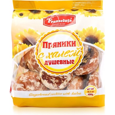 Franzeluta Perníčky Duševné s chalvou 400g Složení: pšeničná mouka, cukr, přípravek ze slunečnicových semen (9,1%) (slunečnicová semínka, cukr, sirup z invertního cukru,...