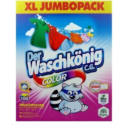 Der Waschkönig 100 pracích dávek Color 6 kg Oblíbený německý prací prášek Waschkönig 100 dávek Color 6 kg s vysokou čistící účinností na barevné prádlo. Výborné prací výsledky v odstraňování skvrn. Extra svěžest. Oživuje již vybledlé barvy. Pečuje o strukturu vláken....