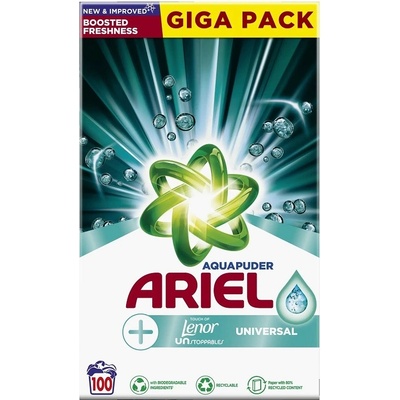 Kompaktní práškový prací prostředek s příjemnou svěží vůní vhodný na bílé i barevné prádlo. Nyní Ariel Universal poskytuje zlepšené výsledky praní vašeho oblíbeného oblečení při zachování vynikajících výsledků při odstraňování skvrn.