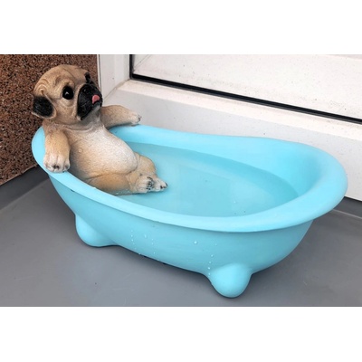 Dekorace psa ve vaně, možné využití jako pítko nebo obal na květiny Rozměr: 23 x 14 cm Materiál: polyston Jde o dekorační předmět, nejedná se o hračku