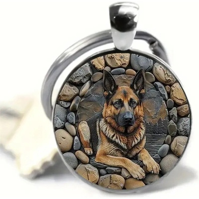 Krásný přívěsek na klíče se psem - německým ovčákem. Klíčenka s populárním plemenem německý ovčák je vhodná pro všechny milovníky psů. Na klíčence je ležící chundelatý německý...