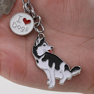 Krásný přívěsek na klíče se psem - husky. Na přívěsku nápis I love dogs (miluji psy). Klíčenka s populárním plemenem husky je vhodná pro všechny milovníky psů.