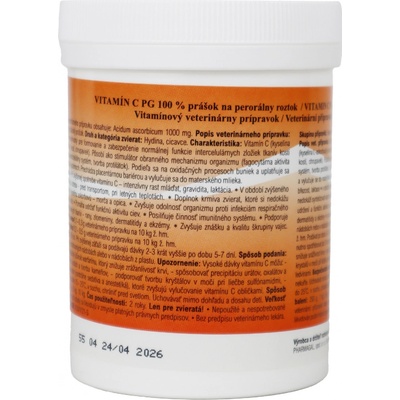 Popis produktu: Prášek pro perorální roztok. Cílový druh: savci, drůbež Charakteristika: vitamín C (kyselina L-askorbová) je nutný pro formování a zabezpečení normální funkce intercelulárních složek kostních tkání (spojivových tkání, kostí, chrupavek). Působí jako...