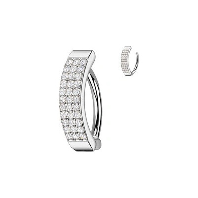 Pokud Vás již nudí klasické pupíkovky, pak Vás jistě zaujme tento nový typ piercingu do pupíku s ozdobným štítem dekorovaným třemi pruhy zirkonů čiré barvy Tyčka tohoto...