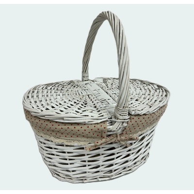 Piknikový košík upletený z vrbového proutí. Vnitřek košíku je potažen režnou látkou potištěnou červenými srdíčky. Látku lze sejmout a vyprat. Barva šedá.