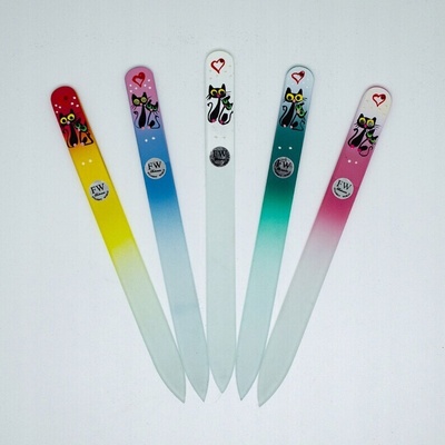 SADA 5 KS SKLENĚNÝCH PILNÍKŮ NA NEHTY S MOTIVEM 2 KOČEK. Skleněné pilníky na nehty jsou vyrobeny z českého tvrzeného skla nejvyšší kvality, ručně malované na rukojeti a zdobené...